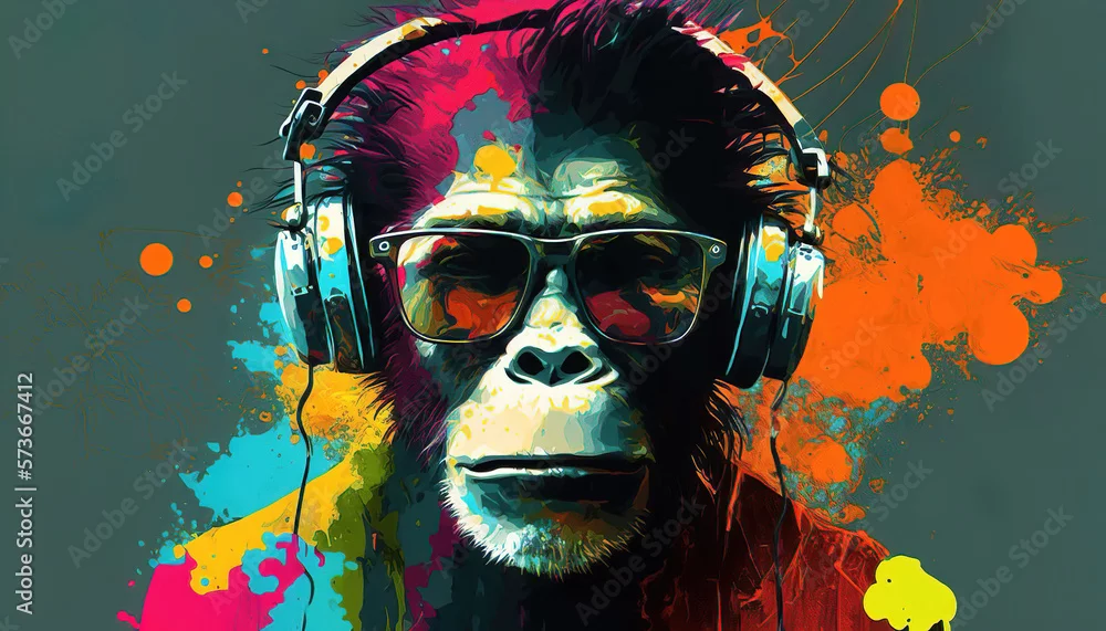 Fototapeta samoprzylepna portrait of a party monkey ape with headphones on a colorful abstract background, generative ai