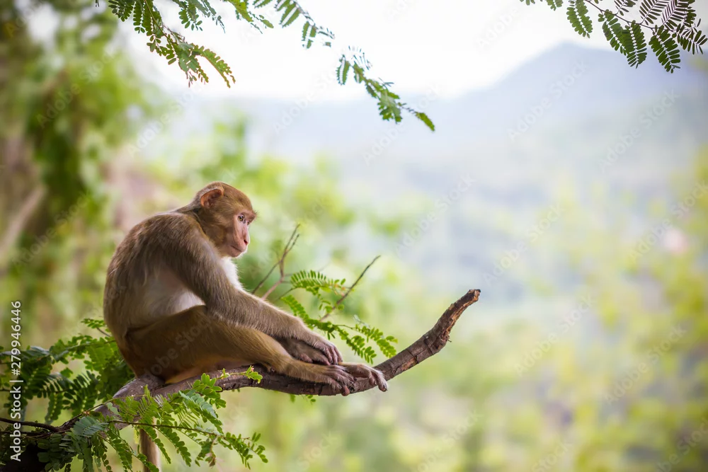 Fototapeta samoprzylepna Samiec małpy obsiadanie na długouszki gałąź i góry tle.