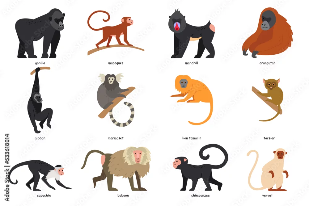Fototapeta samoprzylepna Set of monkey breeds. Cartoon gorilla, gibbon, capuchin, baboon, marmoset, mandrill