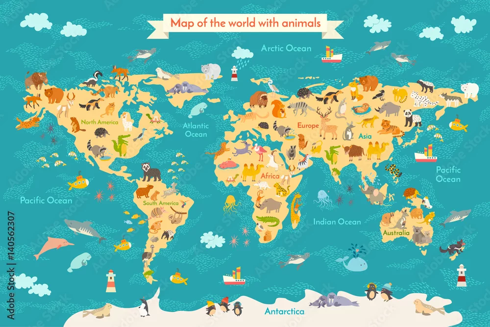 Fototapeta samoprzylepna Mapa zwierząt dla dziecka. Światowy wektorowy plakat dla dzieci, śliczny ilustrowany. Glob kreskówka przedszkola ze zwierzętami. Oceany i kontynent: Ameryka Południowa, Eurazja, Ameryka Północna, Afryka, Australia. Mapa świata dla dzieci