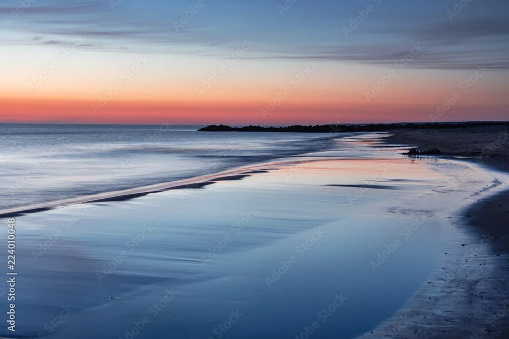 Fototapeta samoprzylepna Letniej nocy słońca plaży kolorowe światło na duńskiej plaży w spokojny wieczór z nieba odbicie na mokrym piasku. Lønstrup w Północnej Jutlandii w Danii, Skagerrak, Morze Północne