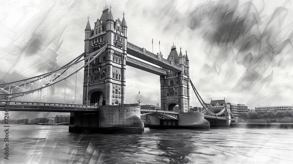 Fototapeta samoprzylepna Tower Bridge in London on a cloudy day.. Black black pencil artistic drawing, on white background. Ai generative.