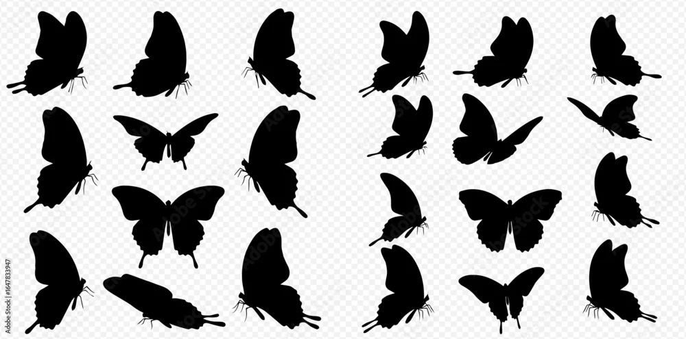 Fototapeta samoprzylepna A collection of black butterfly silhouettes shown from multiple angles and in various flight poses.