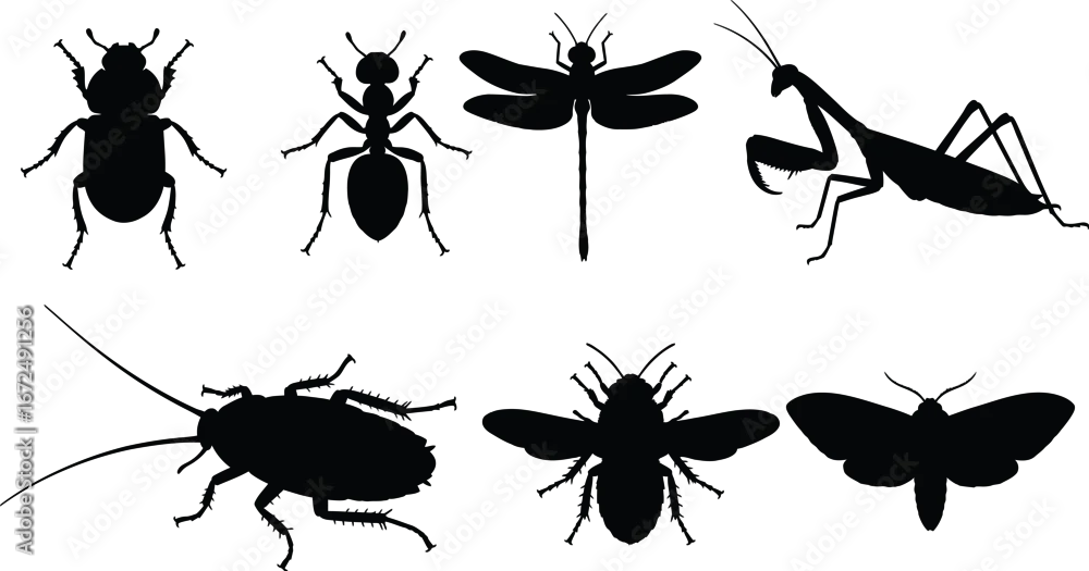 Fototapeta samoprzylepna Diverse insect silhouettes collection featuring beetle ant dragonfly praying mantis bee butterfly cockroach silhouette