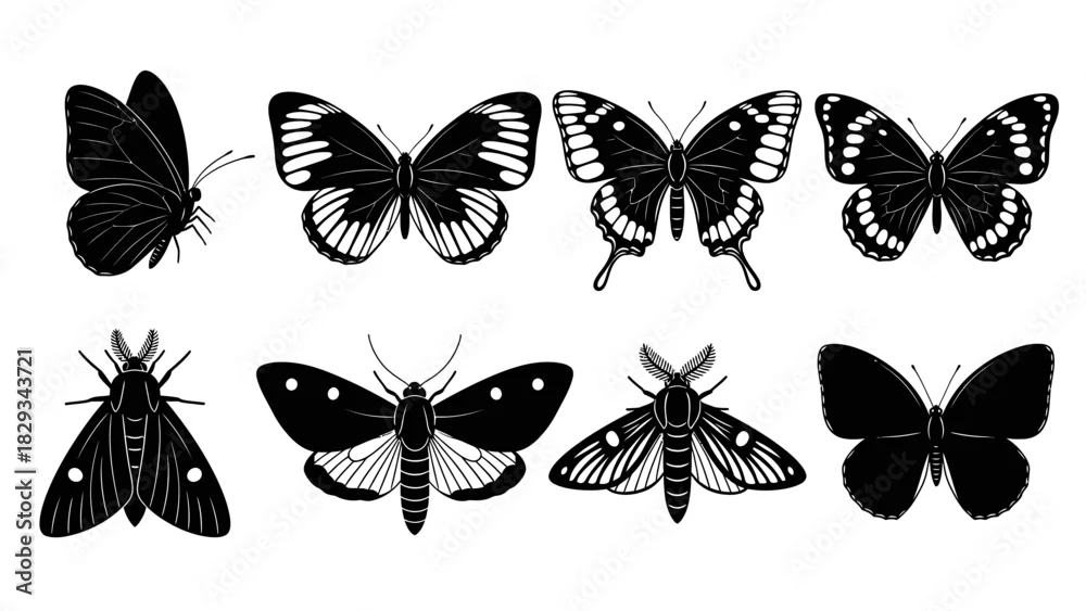 Fototapeta samoprzylepna Elegant collection of various monochrome butterfly and moth species in silhouette style