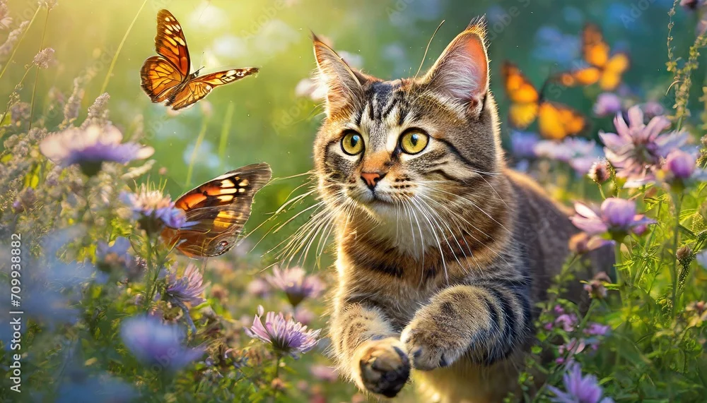 Fototapeta samoprzylepna Kot polujący na motyle na łące