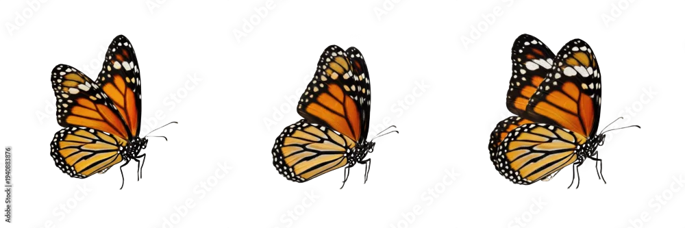 Fototapeta samoprzylepna Monarch butterfly set, orange Danaus plexippus collection for nature and garden design, flying insect wildlife specimens, isolated on white background, PNG cutout