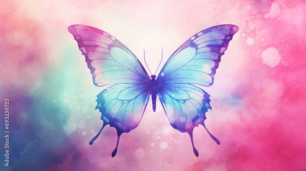 Fototapeta samoprzylepna Papillon bleu et violet sur un fond lumineux et coloré. Rose, aquarelle, lumière. Insecte, beauté, nature. Arrière-plan pour conception et création graphique.