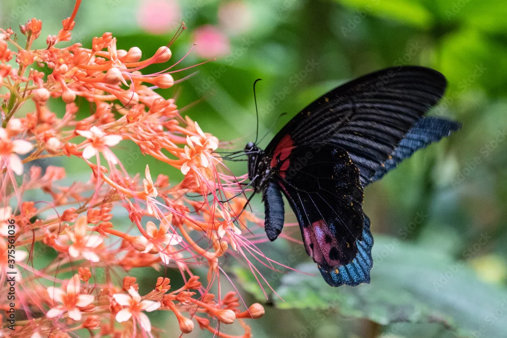 Fototapeta samoprzylepna Papillon noir aux ailes rouges et bleues sur fleurs tropicales – Scène naturelle et colorée
