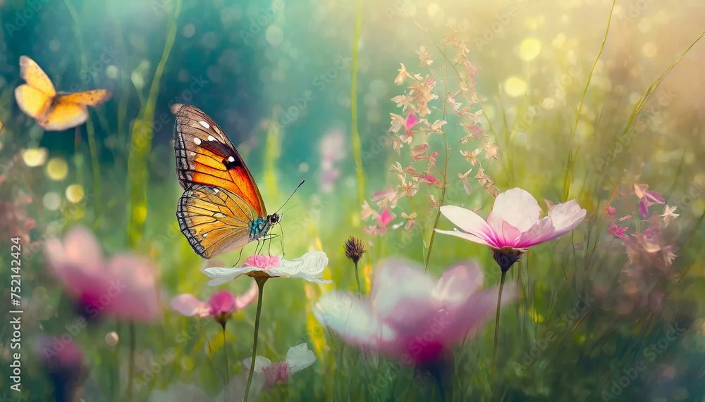 Fototapeta samoprzylepna Wiosenne tło z motylami, kwiatami i trawami
