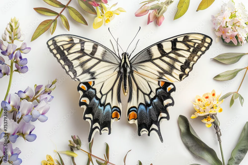Fototapeta samoprzylepna Wzorzysty motyl siedzący między roślinami