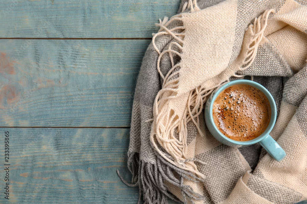 Fototapeta samoprzylepna Filiżanka gorący zima napój i ciepły szalik na drewnianym tle, odgórny widok z przestrzenią dla teksta. Przytulny sezon