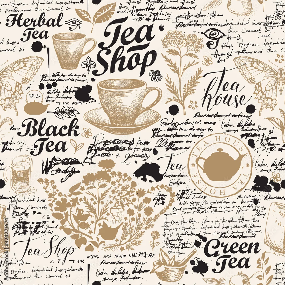Fototapeta samoprzylepna Vector seamless pattern on the tea theme with sketches, unreadable notes, inscriptions, blots. Abstract hand-drawn background in retro style. Suitable for Wallpaper, wrapping paper, background, fabric