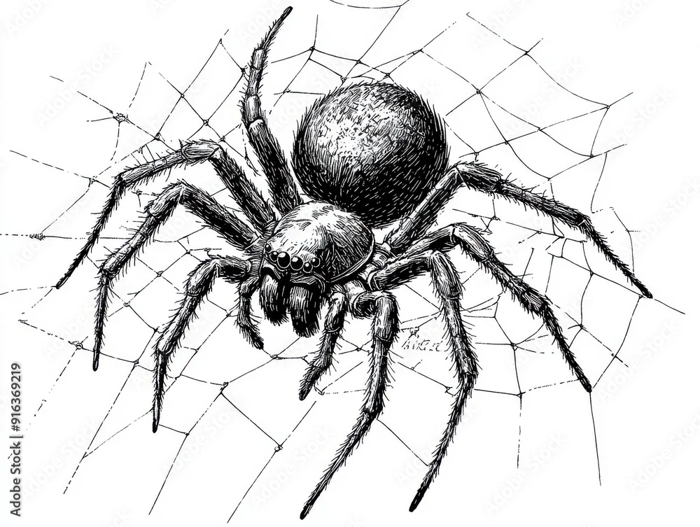 Black and white Vintage engraved art of a spider crawling on a web with intricate details, isolated on white background, ink sketch illustration, simple vector art design, highly detailed line art