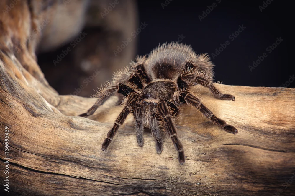 Fototapeta samoprzylepna Duży pająk czołga się na karpie na czarnym tle - pająki - Picturewall.pl