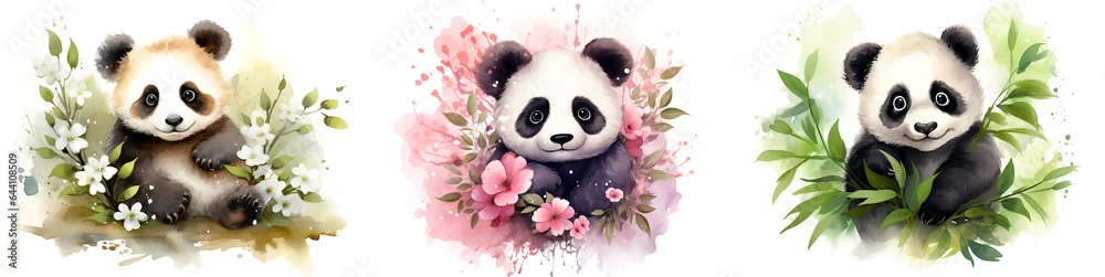 Cute cartoon panda illustration set. Aquarelle panda illustration collection for children book. Kids book colorful illustrations with panda bear, watercolor drawing