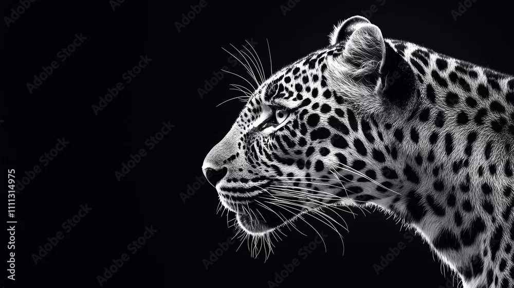 Fototapeta samoprzylepna black and white leopard portrait, serene yet fierce, fine digital texture, deep contrast on black background, danger aura, isolated on black