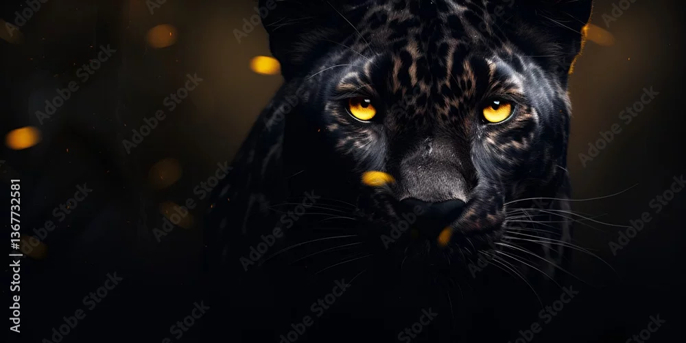 Fototapeta samoprzylepna Black leopard with yellow eyes on a black background, animal wallpaper. bokeh background