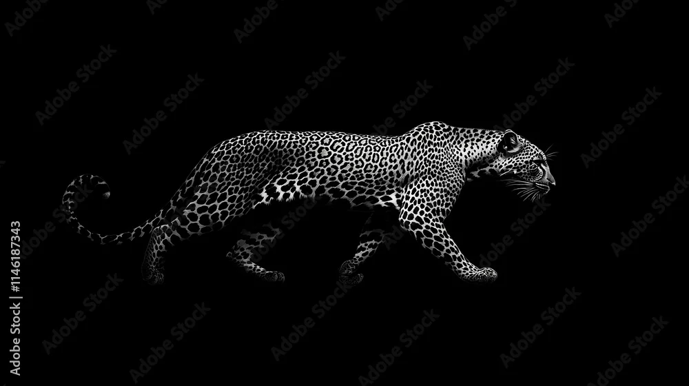 Fototapeta samoprzylepna Majestic leopard walking in profile, black and white.