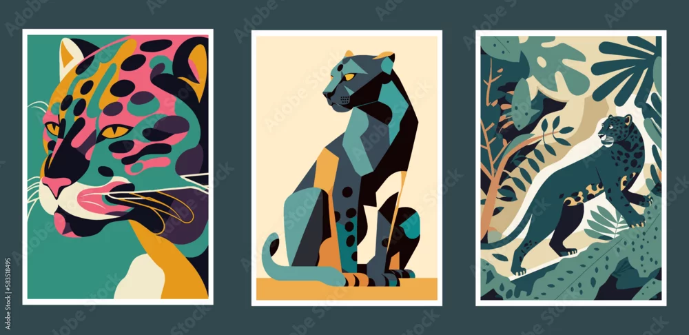 Fototapeta samoprzylepna Set of vector posters with leopards and tropical leaves. Collection of cards with wild animals.