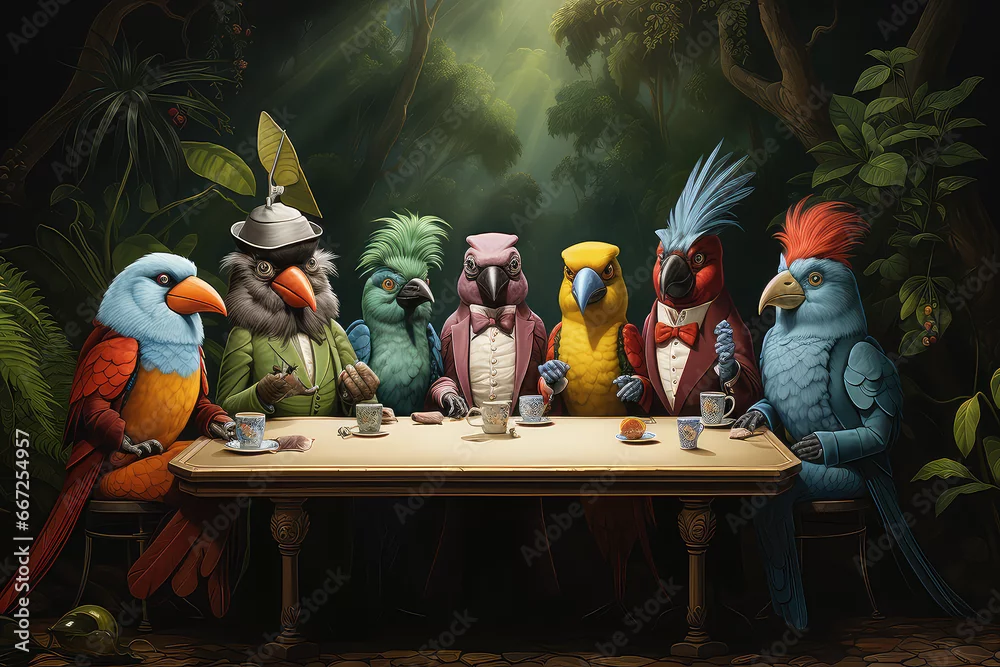 Fototapeta samoprzylepna Egzotyczne papugi przy stole pełnym jedzenia.