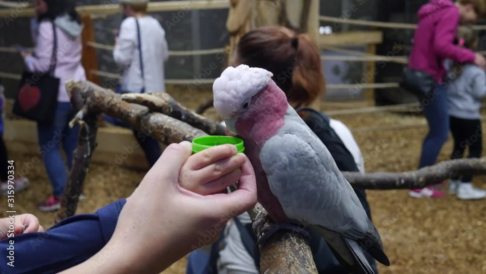 Fototapeta samoprzylepna Karmienie papugi siedzącej na drążku ziarnem w pudełeczku. Papugarnia.