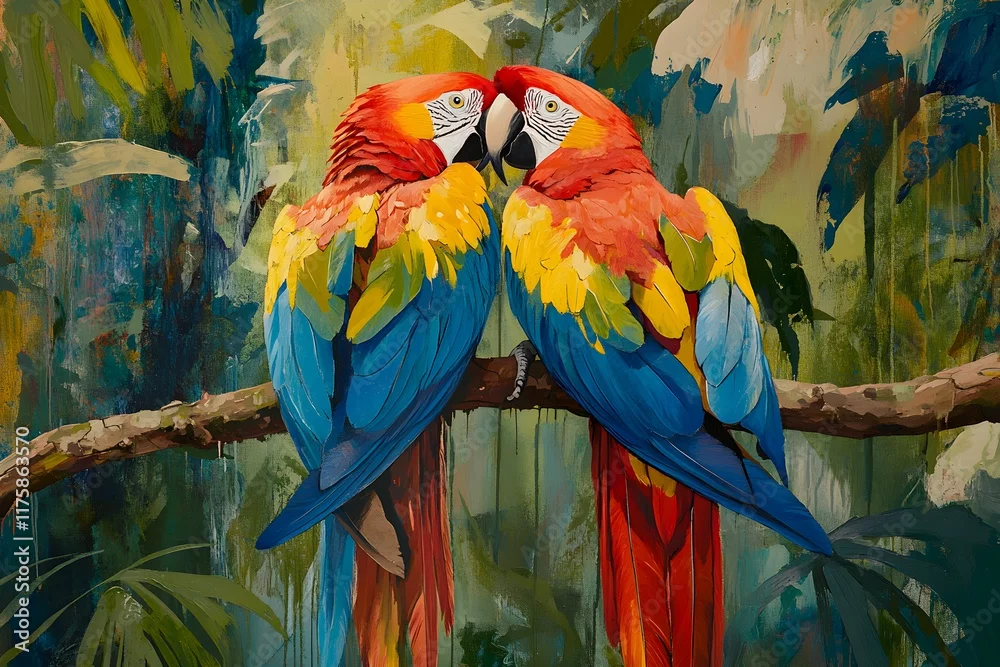 Fototapeta samoprzylepna papugi, maki, tropiki, las deszczowy, zieleń, piękno natury, dzikie ptaki, egzotyka, ptactwo, tropikalne lasy, tropikalna fauna, kolorowe ptaki, para, przyroda, zwierzęta egzotyczne, harmonia, fauna,