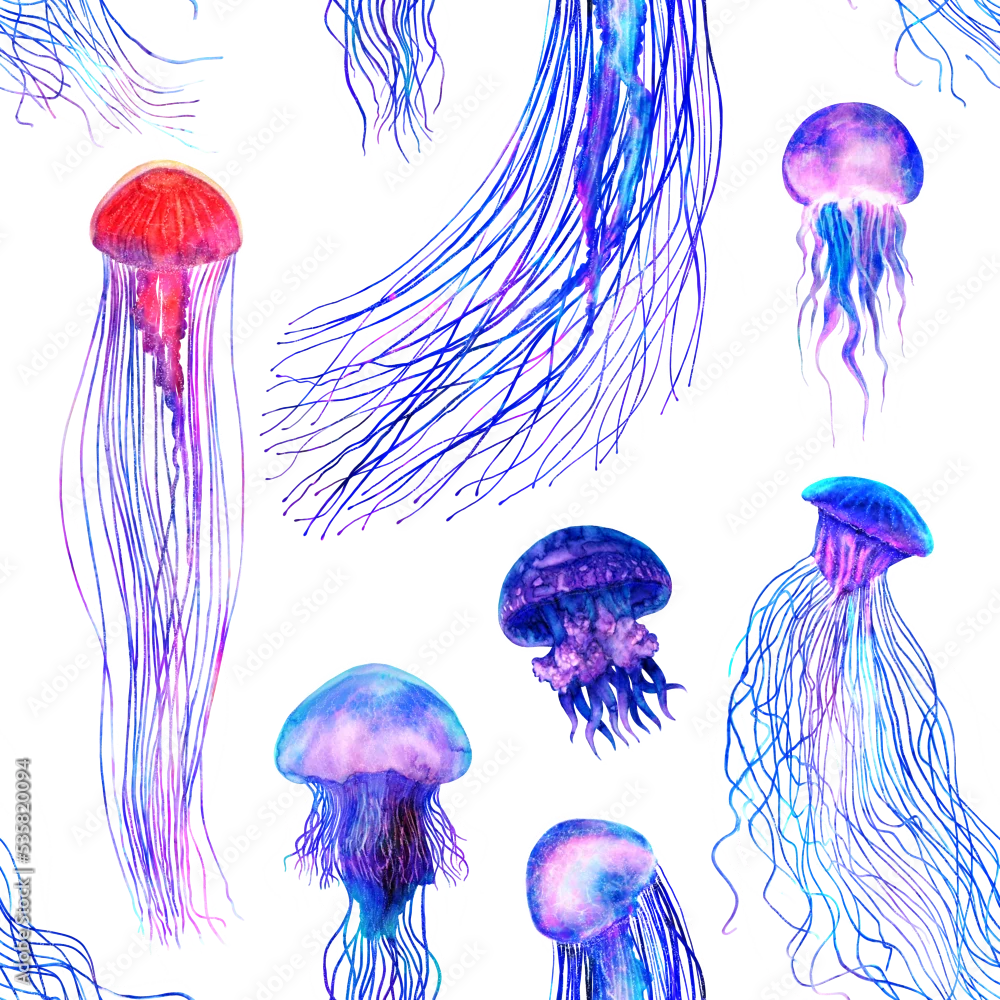 Fototapeta samoprzylepna Pattern seamless jellyfishes PNG. Space colorful repeat texture wallpaper illustration Night galaxy watercolor jelly fishes in bright style vivid blue purple violet isolated on transparent background - Picturewall.pl