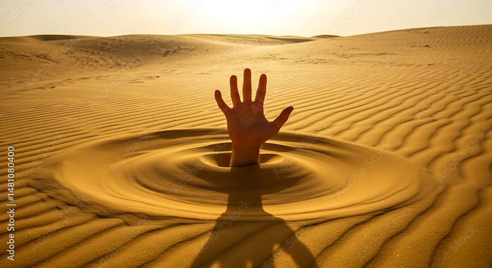 Fototapeta samoprzylepna Hand emerging from golden sand ripples in arid desert landscape texture
