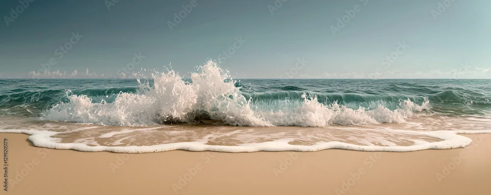 Ocean Wave Crashing on Shore: A dramatic wave crashes onto the sandy shore, creating a frothy white burst of energy. The turquoise water and clear sky provide a vibrant backdrop.