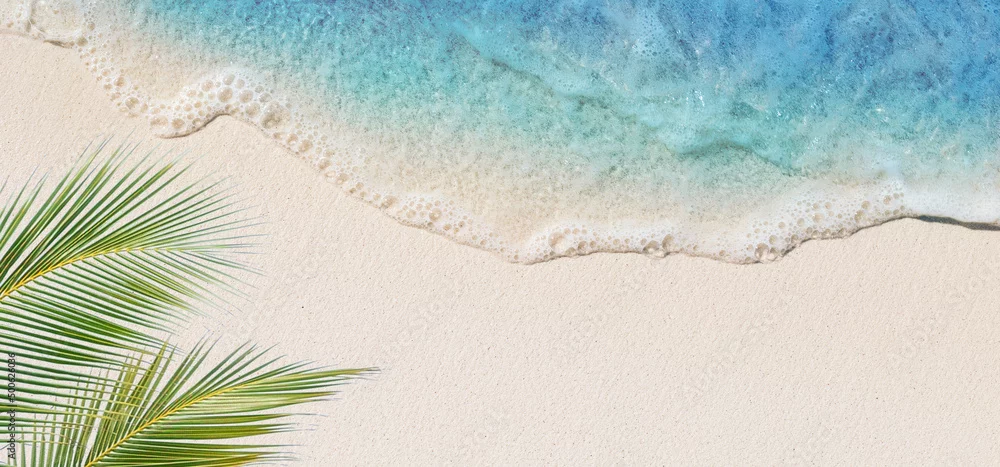 Tropical beach background with sea waves, white sand and foam - summer holiday panoramic top view background. Travel and beach vacation, copy space for text.