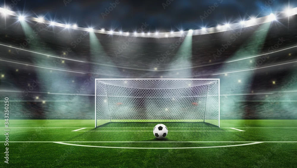 Fototapeta samoprzylepna ball on the green field at soccer stadium. ready for game in front of the soccer goal