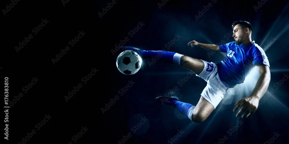 Fototapeta samoprzylepna Piłkarz wykonuje akcję akcji na ciemnym tle. Gracz ma na sobie niemarkowy mundur sportowy.