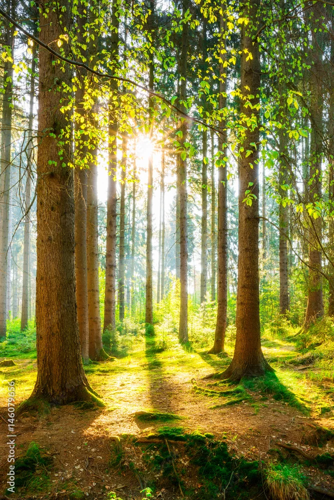 Fototapeta samoprzylepna Poranek w lesie z jasnym słońcem - Picturewall.pl