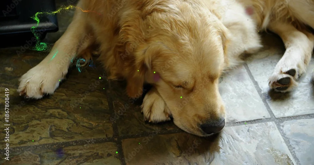 Fototapeta samoprzylepna Lying golden retriever resting head on paw on kitchen tiles, paws and green-purple speckles