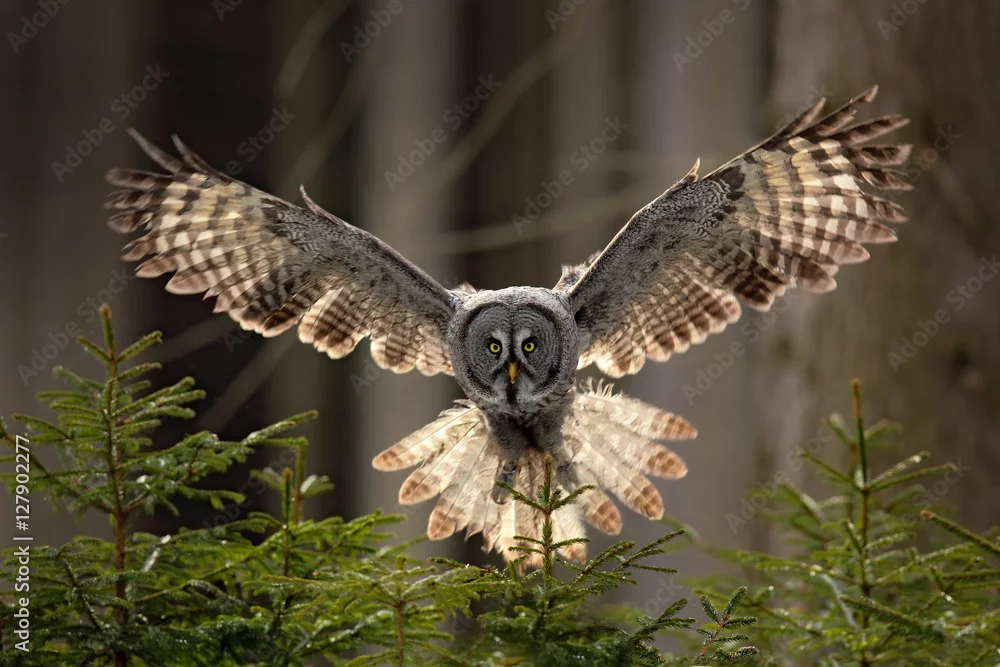 Fototapeta samoprzylepna Action scene from the forest with owl. Flying Great Grey Owl, Strix nebulosa, above green spruce tree with orange dark forest background. Wildlife in Sweden. Bird in fly with open wing.
