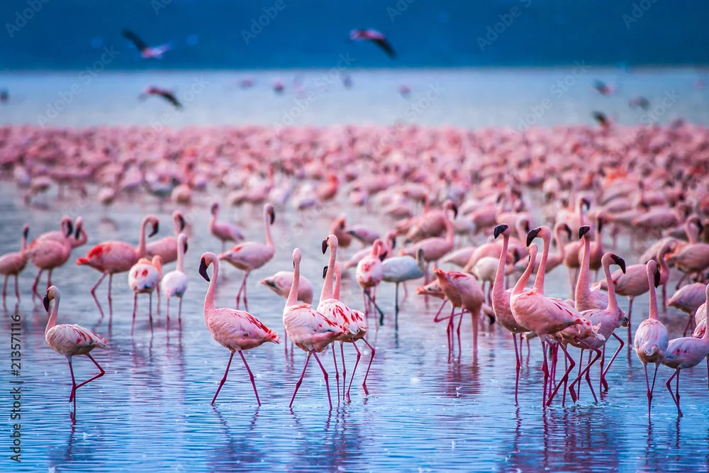 Fototapeta samoprzylepna Afryka. Kenia. Lake Nakuru. Flaming. Stado flamingów. Natura Kenii. Ptaki Afryki. - ptaki - Picturewall.pl
