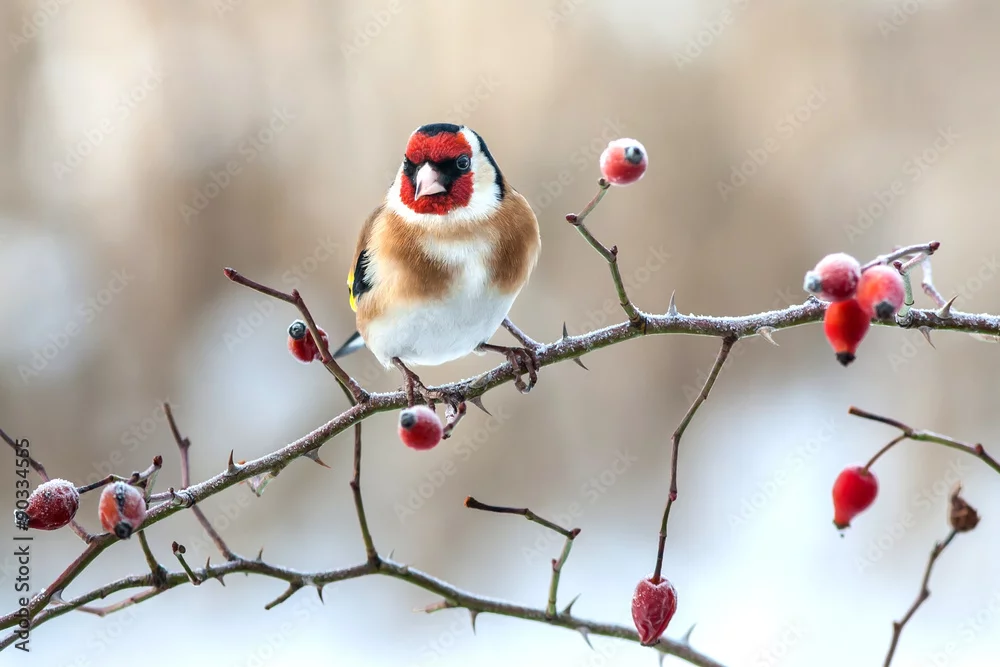 Fototapeta samoprzylepna European Goldfinch with frozen red rose hips.