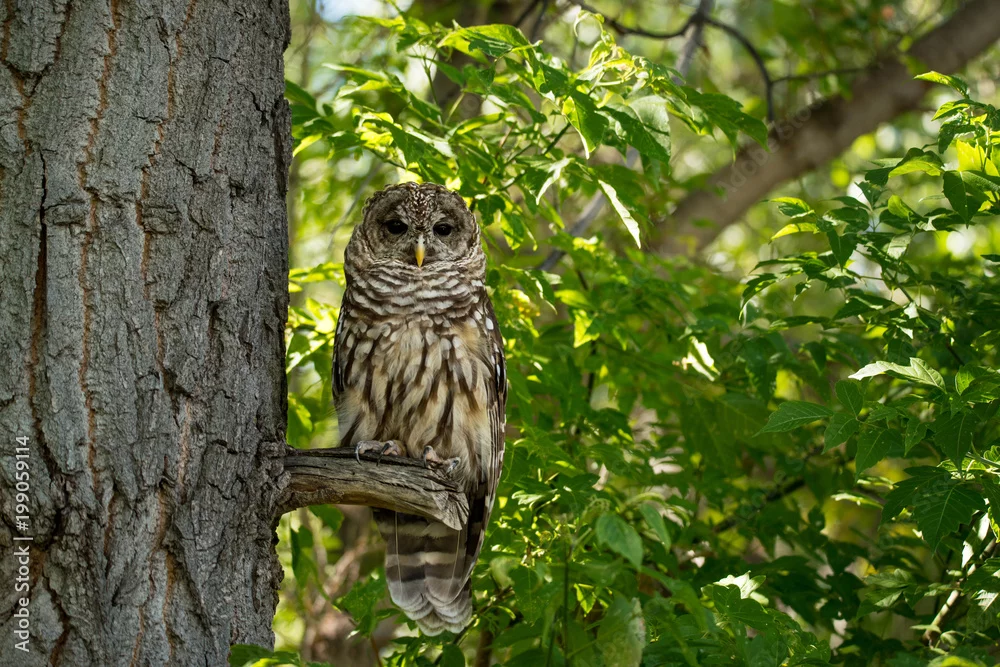 Fototapeta samoprzylepna Northern spotted owl on tree branch in green forest