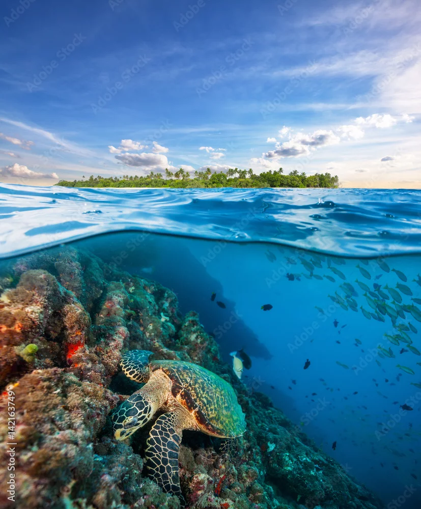 Fototapeta samoprzylepna Hawksbill Sea Turtle exploring coral reef under water surface