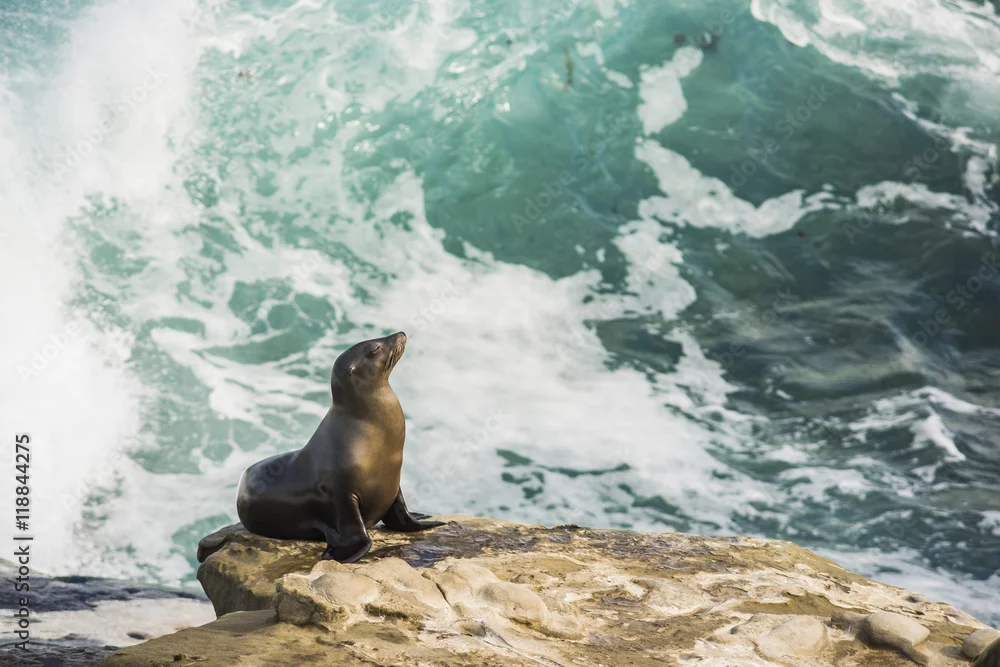 Fototapeta samoprzylepna Single arched and wet sea lion sun bathing on a cliff with crashing waves in the background in La Jolla cove, San Diego, California