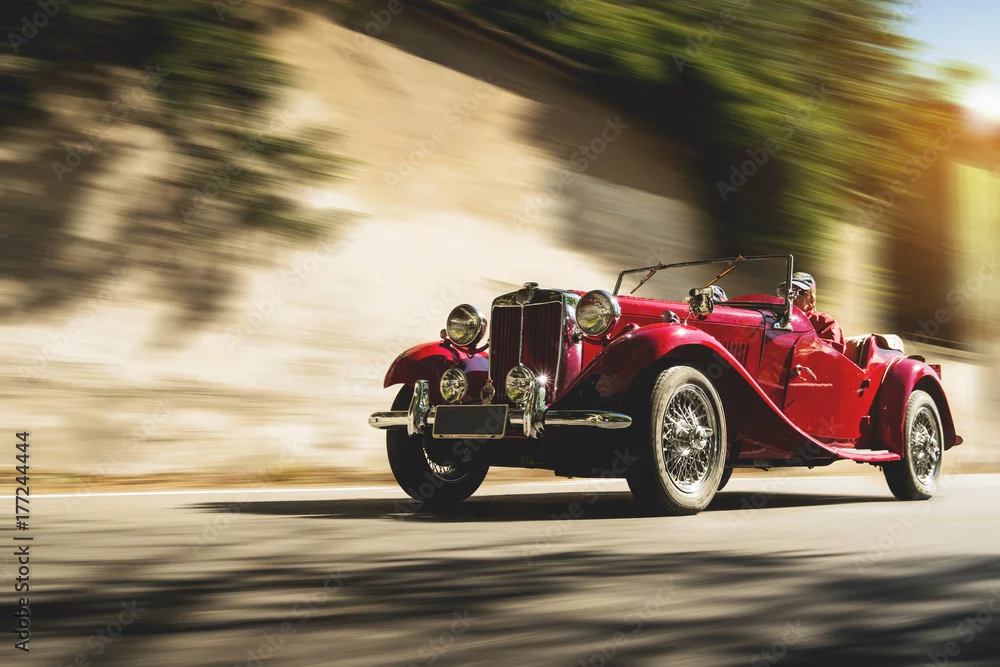 Fototapeta samoprzylepna Czerwony rocznika samochód przy zmierzchem