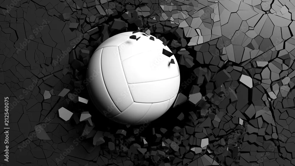 Fototapeta samoprzylepna Piłka do siatkówki przedziera się siłą przez czarną ścianę. 3d ilustracji.