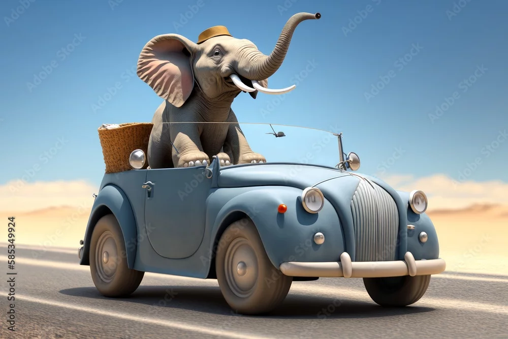 Fototapeta samoprzylepna Elephant driving convertible car, enjoying, IA