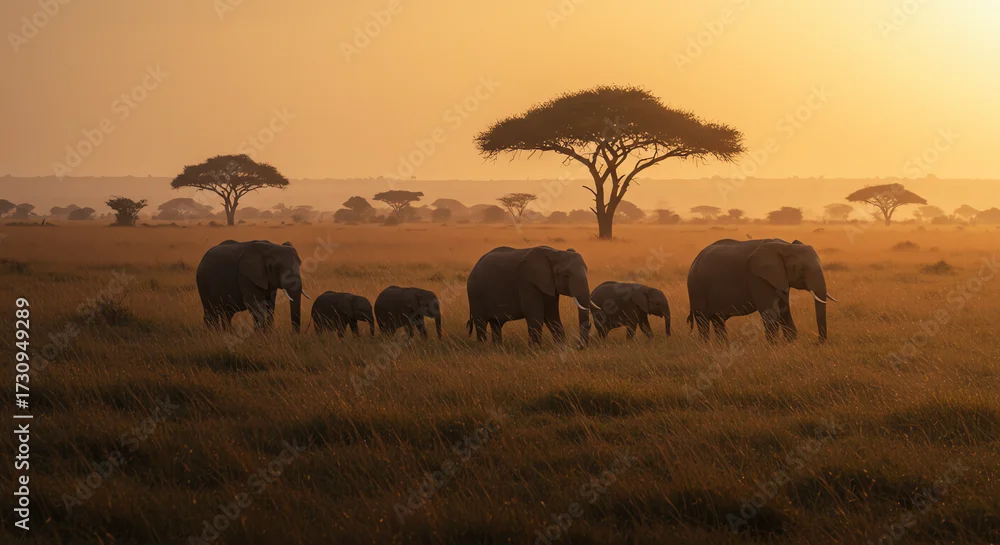 Fototapeta samoprzylepna Elephant family walking in African savanna sunset - słonie - Picturewall.pl