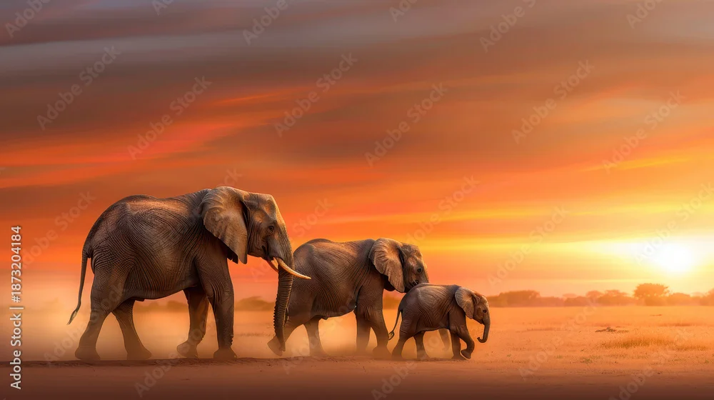 Elephant family walking on dusty savannah during vibrant orange sunset with warm light creating peaceful and majestic atmosphere