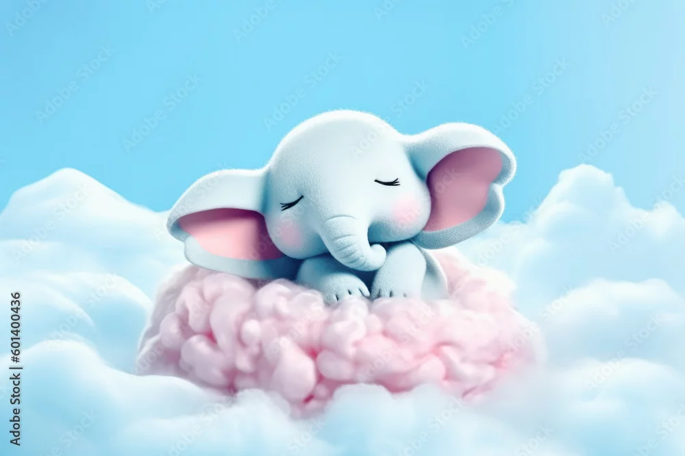 Fototapeta samoprzylepna Lindo elefante entre nubes de algodon rosa y cielo azul durmiendo. Ilustracion de IA generativa