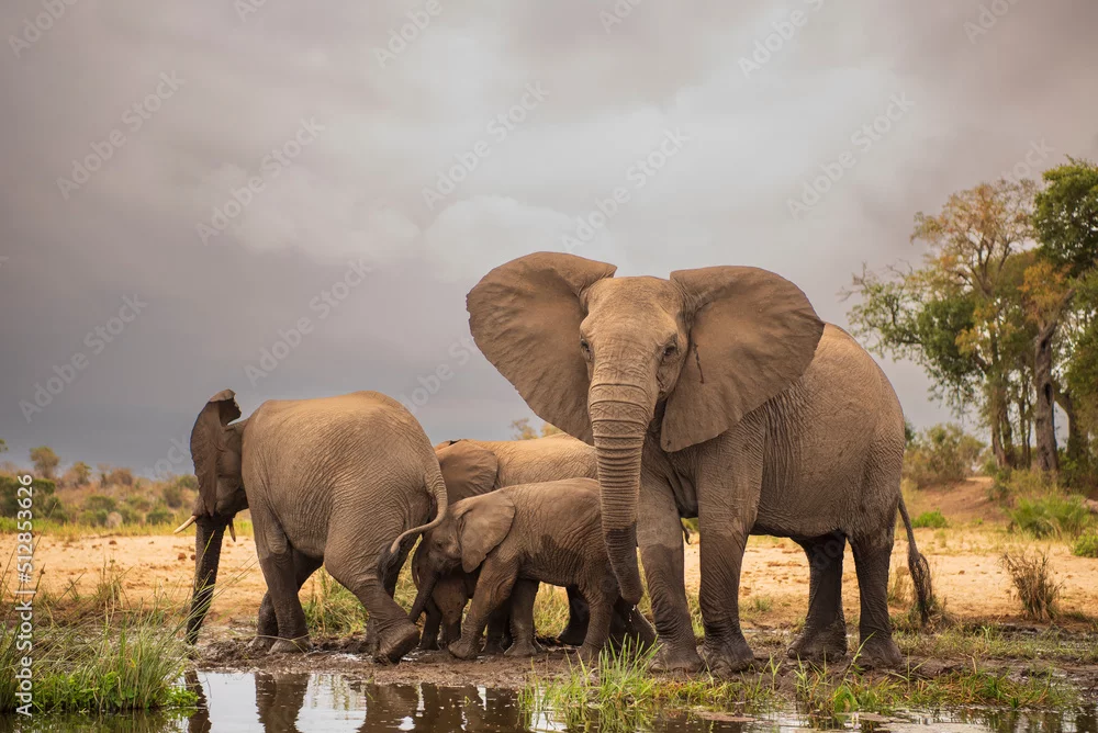Fototapeta samoprzylepna Manda de elefantes en el Parque Nacional Kruger en Sudáfrica frente al lago para refrescarse