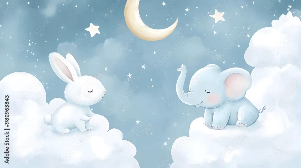 Fototapeta samoprzylepna un fondo infantil con estrellas y luna sobre las nubes un conejo y un elefante bebe fondo tierno y adorable para cuadro decorativo o invitacion digital o tarjeta