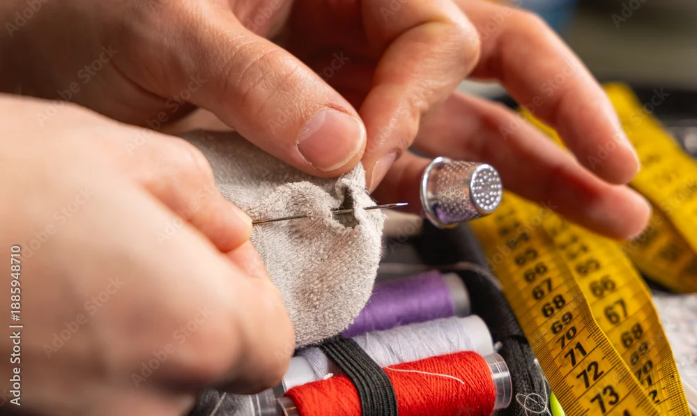 Une personne en train de réparer un trou dans une chaussette avec une aiguille, du fil et un dé à coudre. En arrière plan, une trousse à couture avec des bobines de fil.
